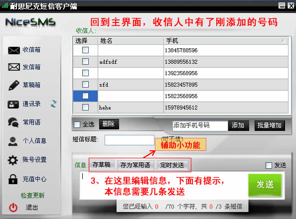 第三步,初次进入界面需要添加联系人,如果短信平台已经有联系人,可以使用“同步联系人”功能将联系人同步到客户端