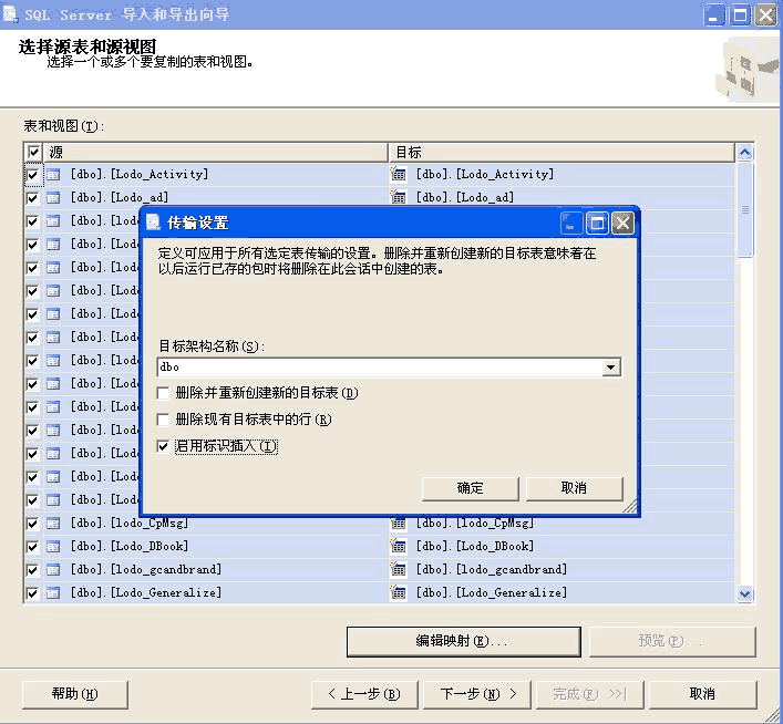 下一步到“选择源表和源视图”选择需要的表后点击“编辑映射”选中“启用标识插入”(自动增长列插入相关)